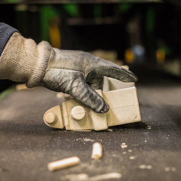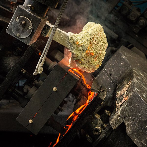 Během slévárenské fáze je speciální forma naplněna roztavenou mosaznou slitinou mědi a zinku, surovinou použitou pro tělo baterie. Z formy se potom získá tvar požadovaného těla baterie.